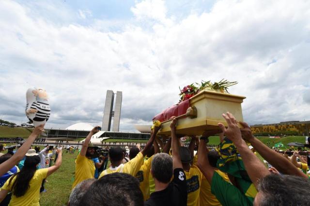 Em Brasília, participantes desfilaram carregando um caixão com uma caricatura da presidente Dilma Rousseff e coberto pela bandeira do PT